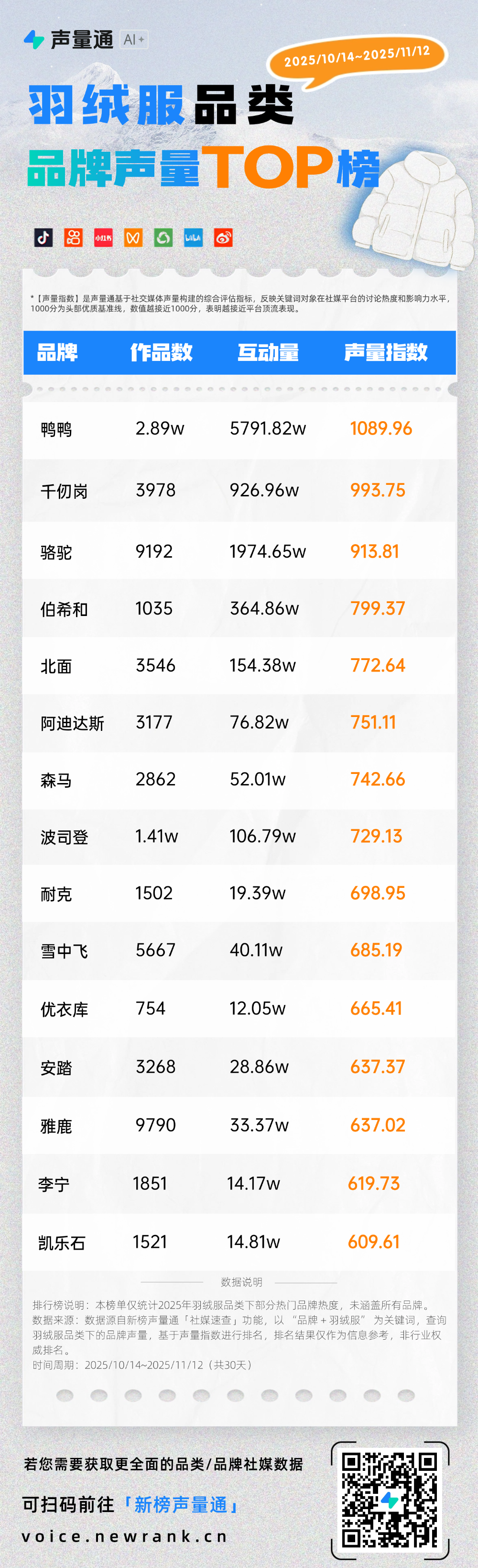 我们整理了近 30 天羽绒服品类品牌社媒声量榜,同时拆解2个典型品牌的营销实操,为品牌提炼出可借鉴、可落地的增长参考: